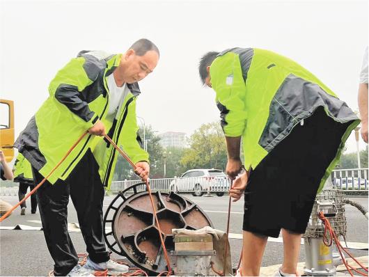 7月12日,聊城市城市管理局市政防汛大隊隊員在易澇地段清理下水井箅子。