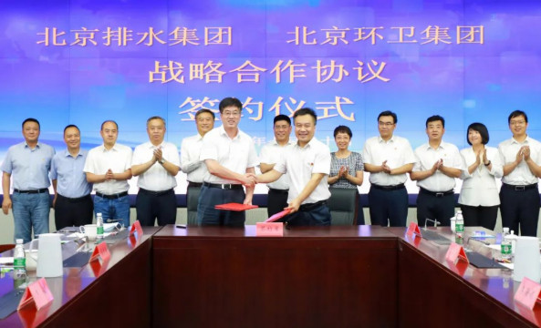 7月20日,北京排水集團(tuán)與北京環(huán)衛(wèi)集團(tuán)簽署戰(zhàn)略合作協(xié)議。北京環(huán)衛(wèi)集團(tuán)黨委書記、董事長高蹤陽,黨委副書記、總經(jīng)理何亮,北京排水集團(tuán)黨委書記、董事長張建新,黨委副書記、總經(jīng)理張榮兵,副總經(jīng)理鄺諾參加簽約儀式。