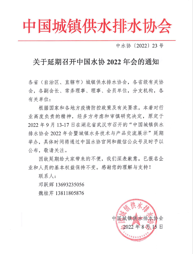 關(guān)于延期召開中國水協(xié)2022年會的通知
