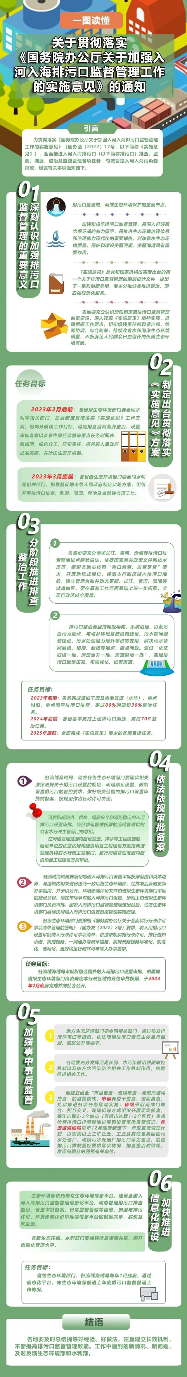 《通知》是貫徹落實《國務(wù)院辦公廳關(guān)于加強入河入海排污口監(jiān)督管理工作的實施意見》(以下簡稱《實施意見》)的重要舉措,從深刻認識加強排污口監(jiān)督管理的重要意義、制定出臺貫徹落實《實施意見》方案、分階段推進排查整治工作、依法依規(guī)審批備案、加強事中事后監(jiān)管、加快推進信息化建設(shè)六個方面,明確細化了要求。