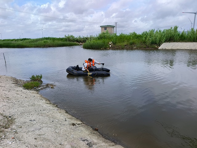 圖為太湖東海局監(jiān)測與科研中心工作人員乘皮劃艇搭載側掃聲吶排查水下排污口
