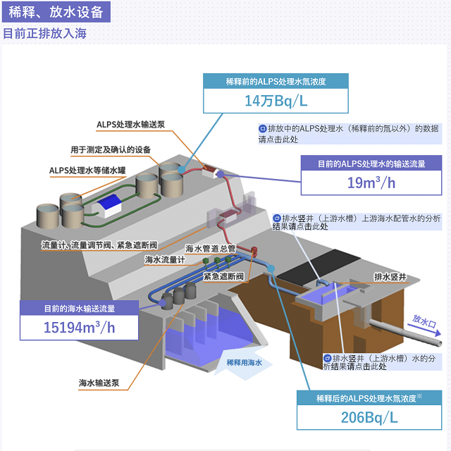 當(dāng)?shù)貢r(shí)間8月29日21時(shí)的實(shí)時(shí)數(shù)據(jù)顯示,所謂“ALPS處理水”以每小時(shí)19立方米的速率流出管道,另一邊用于稀釋氚的海水以每小時(shí)15194立方米的速率流出,與“ALPS處理水”匯集,一同流向排水豎井,最終入海的核污水中氚濃度檢測(cè)值為206貝克勒爾/升。世衛(wèi)組織2017年發(fā)布的《飲用水質(zhì)量標(biāo)準(zhǔn)》規(guī)定,飲用水中氚的含量不得超過10000貝克勒爾/升。