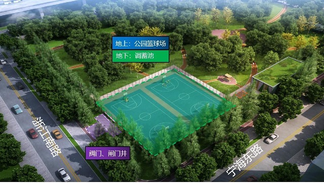 新延安東提標(biāo)調(diào)蓄池位于黃浦區(qū)延福公園西南角的籃球場下方,總占地面積2926.9平方米。通過打造一座“綠色”提標(biāo)調(diào)蓄池,并結(jié)合后期少量的管道翻排,能夠?qū)⑾到y(tǒng)內(nèi)排水能力由一年一遇提升至五年一遇,暴雨天啟用調(diào)蓄池后可有效提高系統(tǒng)的防澇能力,確保地區(qū)的防汛安全。同時(shí),項(xiàng)目結(jié)合公園籃球場建設(shè),通過服務(wù)周邊居民,打造環(huán)境改善、休閑活動(dòng)、城市形象多元化功能體系,實(shí)現(xiàn)中心城土地集約化開發(fā)利用,為中心城區(qū)綠色調(diào)蓄設(shè)施的布局建設(shè)作出了良好的示范。