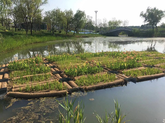 公園中部,寬闊的紫薇大道南北貫穿,連接南北入口。在大道最北端一座橋梁的北側(cè),建設了2個雨水花園,收集周圍的雨水,里面栽種了細葉美女櫻、彩虹石竹、花葉玉簪、紫葉山桃草、花葉美人蕉、細葉芒、矮生蘆竹等多種植物。橋西的河面上,還設置了以太陽能作動力的生態(tài)浮床,用于改善河道水質(zhì)。河道沿線還建設了可溢流生態(tài)屏障,雨水進入可溢流生態(tài)屏障,利用植物根系、漂浮濕地、人工水草作為掛膜基質(zhì),通過生物接觸氧化技術(shù)對微污染雨水進行凈化,從而控制外源污染對自然水體水質(zhì)的影響。栽植的植物品種主要有常綠鳶尾、千屈菜、再力花、苦草等。