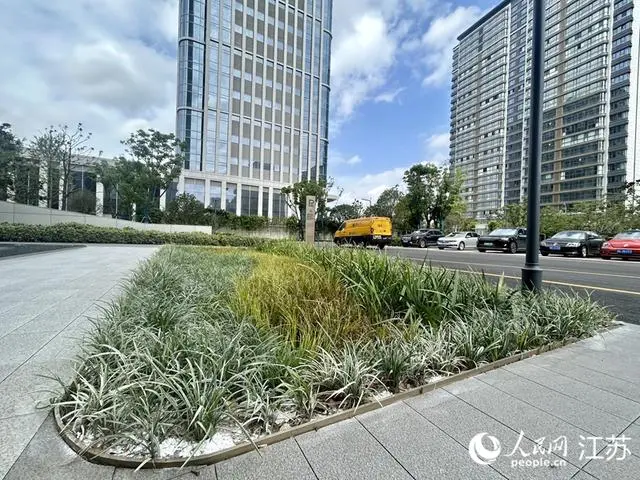 走進揚州建工科技園內的綠地,會發(fā)現(xiàn)一些高出植物的黑色噴頭,這是與雨水回收系統(tǒng)聯(lián)動的自動灌溉系統(tǒng)。這塊吸滿了水的大“海綿”,不僅可以緩解城市熱島效應,增加地塊的生態(tài)調蓄功能,還將滯留和凈化后的雨水用于園區(qū)綠化澆灌和道路噴灑。