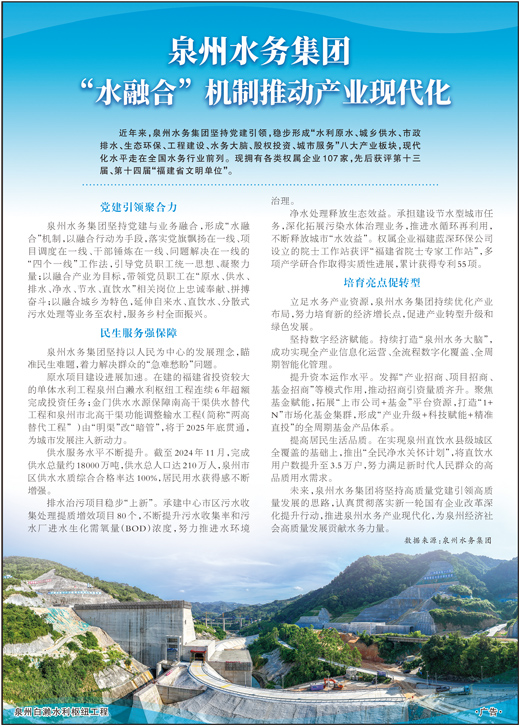 泉州水務集團堅持黨建與業務融合,形成“水融合”機制,以融合行動為手段,落實黨旗飄揚在一線、項目調度在一線、干部錘煉在一線、問題解決在一線的“四個一線”工作法,引導黨員職工統一思想、凝聚力量;以融合產業為目標,帶領黨員職工在“原水、供水、排水、凈水、節水、直飲水”相關崗位上忠誠奉獻、拼搏奮斗;以融合城鄉為特色,延伸自來水、直飲水、分散式污水處理等業務至農村,服務鄉村全面振興。