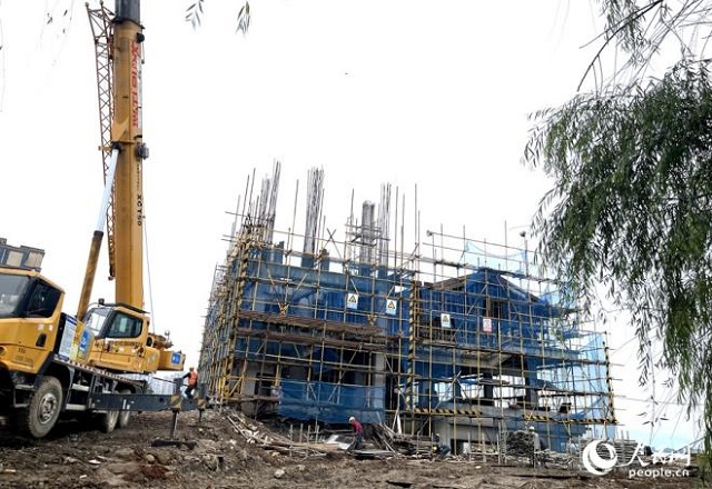 細雨綿綿,工地上一派忙碌景象。人民網(wǎng)記者 陳藍燕攝