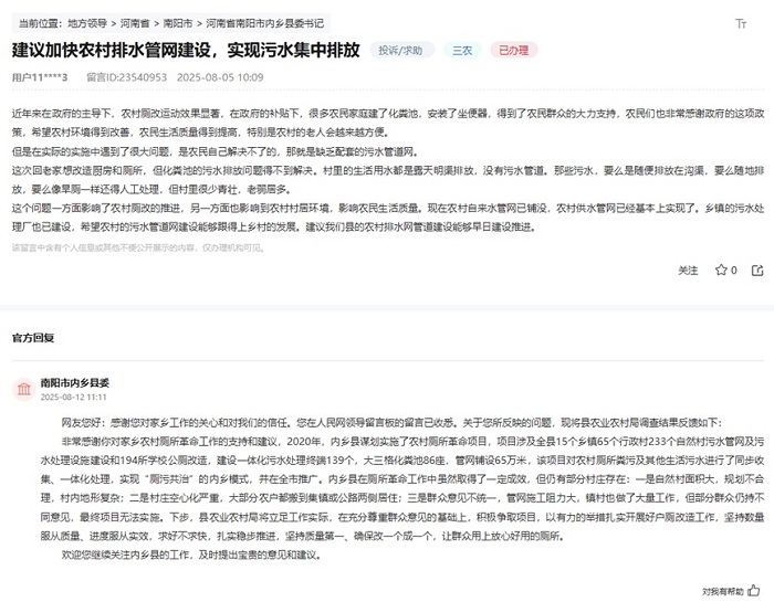 內(nèi)鄉(xiāng)縣農(nóng)業(yè)農(nóng)村局在回復(fù)中坦言,鄉(xiāng)鎮(zhèn)污水處理廠雖已建成,但管網(wǎng)配套仍是短板。“我們正積極爭(zhēng)取項(xiàng)目,以有力的舉措扎實(shí)開展好戶廁改造工作,堅(jiān)持?jǐn)?shù)量服從質(zhì)量、進(jìn)度服從實(shí)效,求好不求快,扎實(shí)穩(wěn)步推進(jìn),堅(jiān)持質(zhì)量第一,確保改一個(gè)成一個(gè),讓群眾用上放心好用的廁所。”