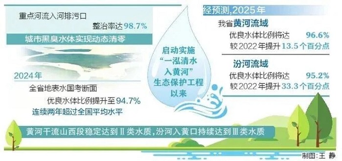 為推動(dòng)黃河流域水生態(tài)環(huán)境整體改善,我省深入推進(jìn)碧水保衛(wèi)戰(zhàn)。強(qiáng)化水資源、水環(huán)境、水生態(tài)“三水”統(tǒng)籌,啟動(dòng)實(shí)施“一泓清水入黃河”生態(tài)保護(hù)工程,重點(diǎn)河流入河排污口整治率達(dá)98.7%,城市黑臭水體實(shí)現(xiàn)動(dòng)態(tài)清零。2024年,全省地表水國考斷面優(yōu)良水體比例提升至94.7%,連續(xù)兩年超過全國平均水平,黃河干流山西段穩(wěn)定達(dá)到Ⅱ類水質(zhì),汾河入黃口持續(xù)達(dá)到Ⅲ類水質(zhì)。
